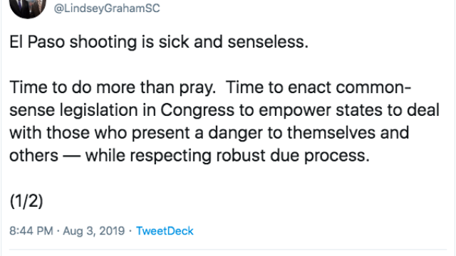 - Senator Lindsey Graham (SC), Chairman of the Senate Judiciary Committee, stated his support for Red Flag laws, announcing he’ll soon introduce a bipartisan bill with Senator Blumenthal (D-CT)…